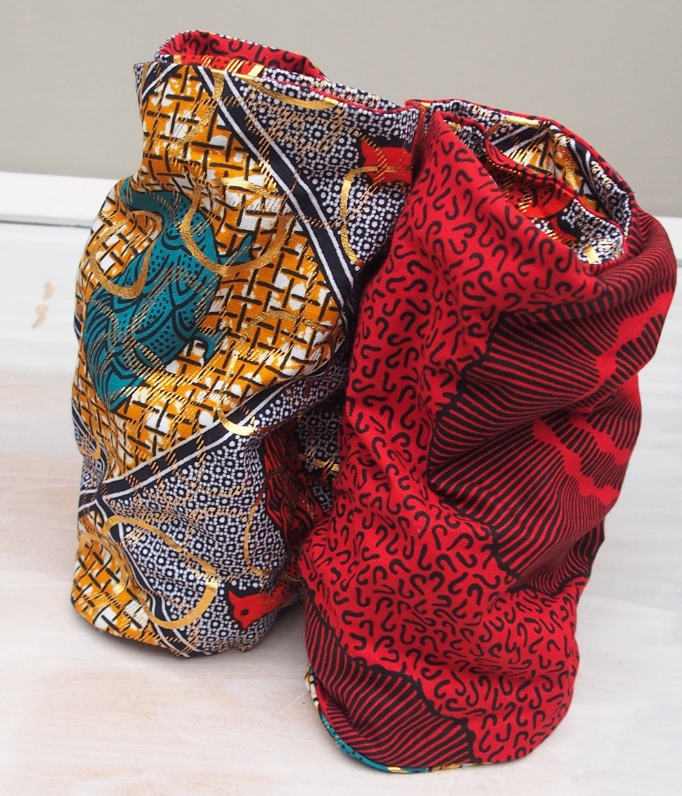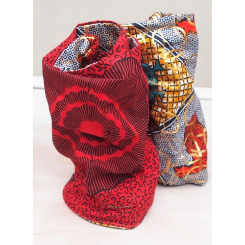 Le tissu employé est d'un côté du Wax Holland suprême et de l'autre côté du Wax Osikani de belle qualité et bonne fabrication; on peut replier le côté cachè sur l'extérieur, on