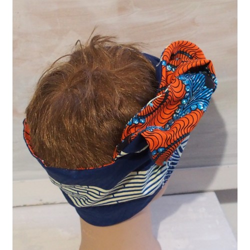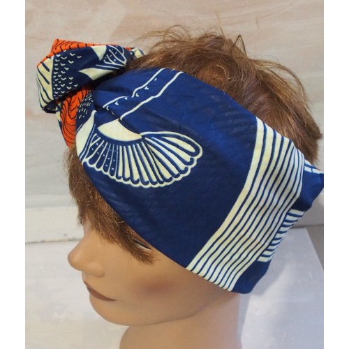BANDEAU z'oreilles en tissu WAX suprême 12198 - tons FACE, wax strass orange et bleu et PILE wax suprême java oiseaux bleu et blanc